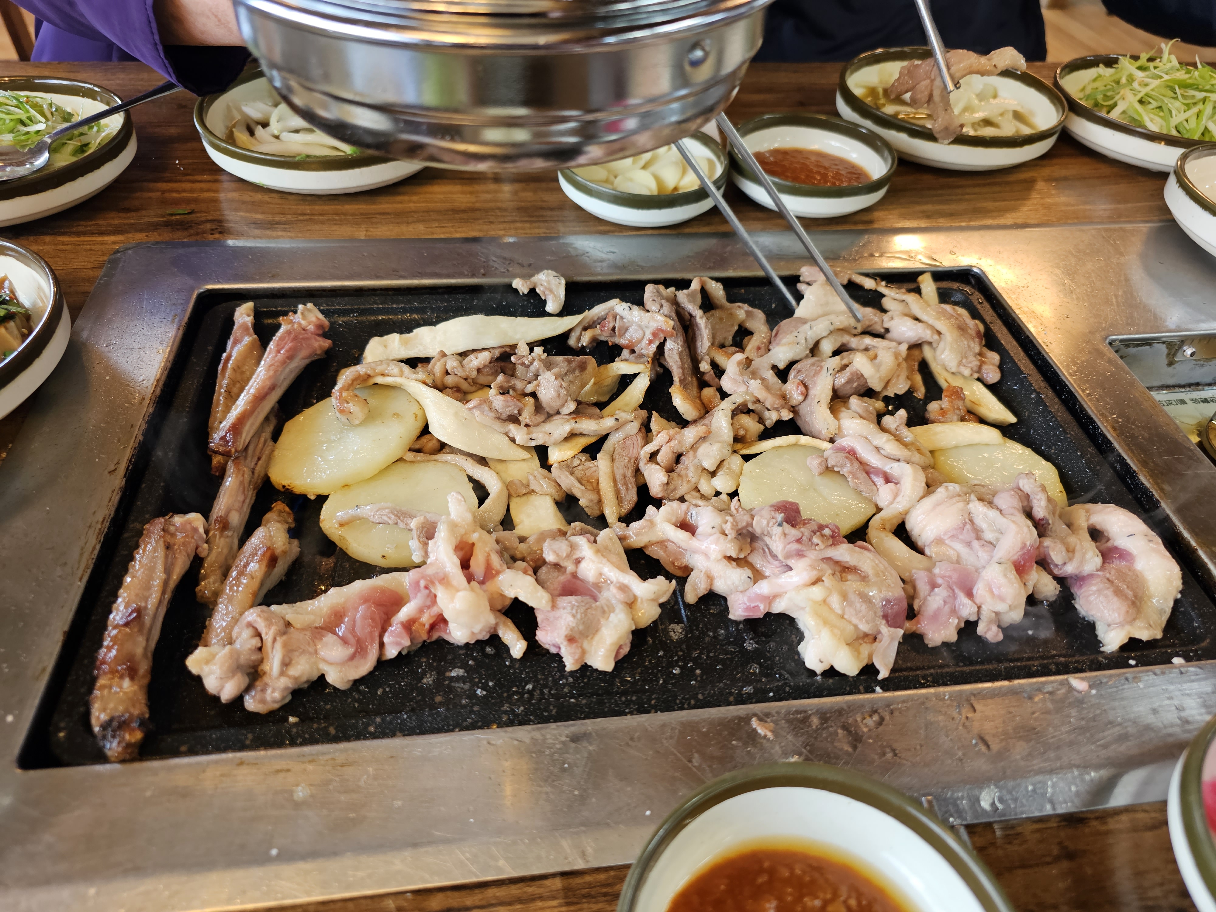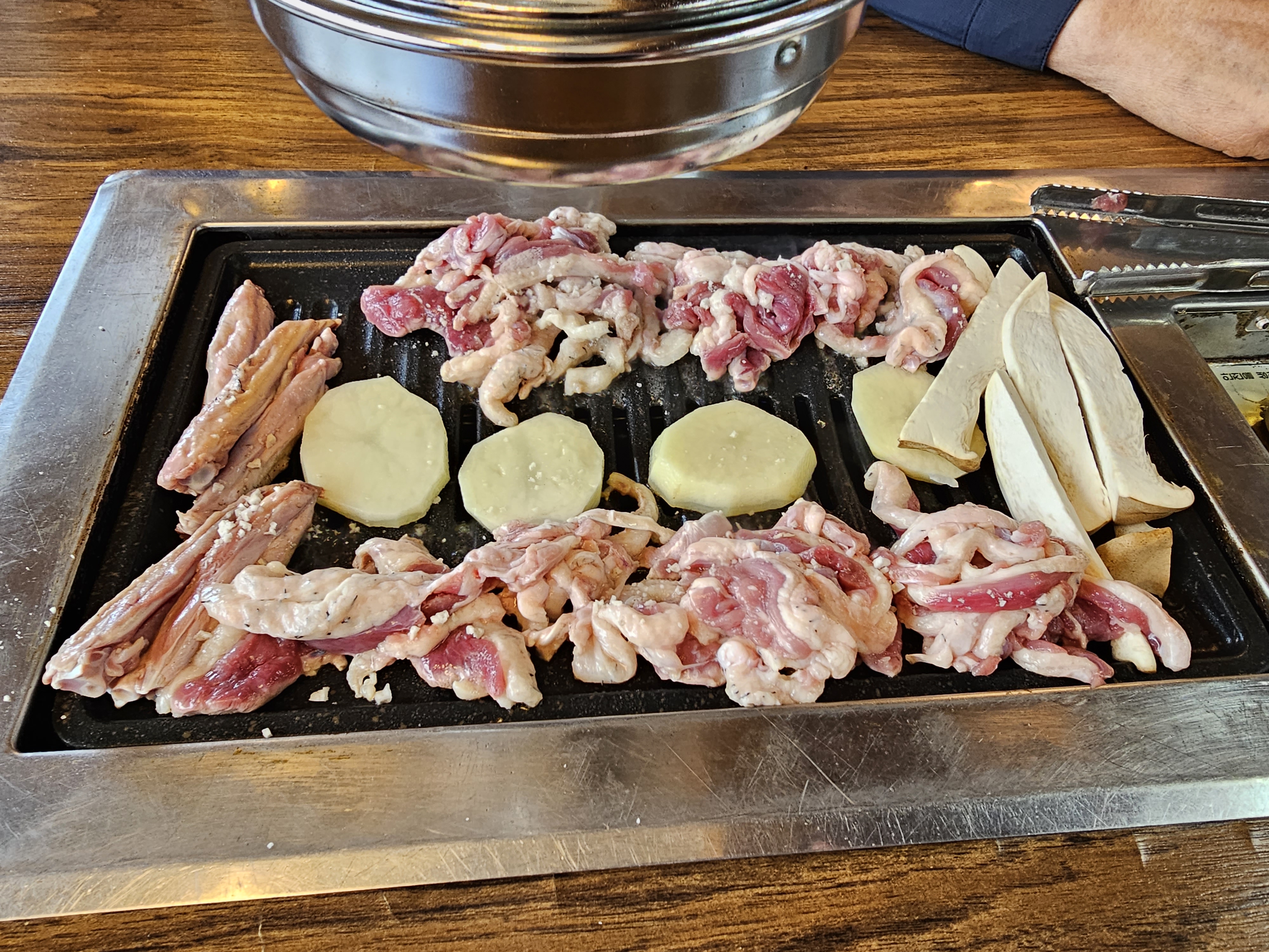타 오리 고기집 가면 대부분불판이 돌판인데 여기는 특이하게 위와 같은 불판임.