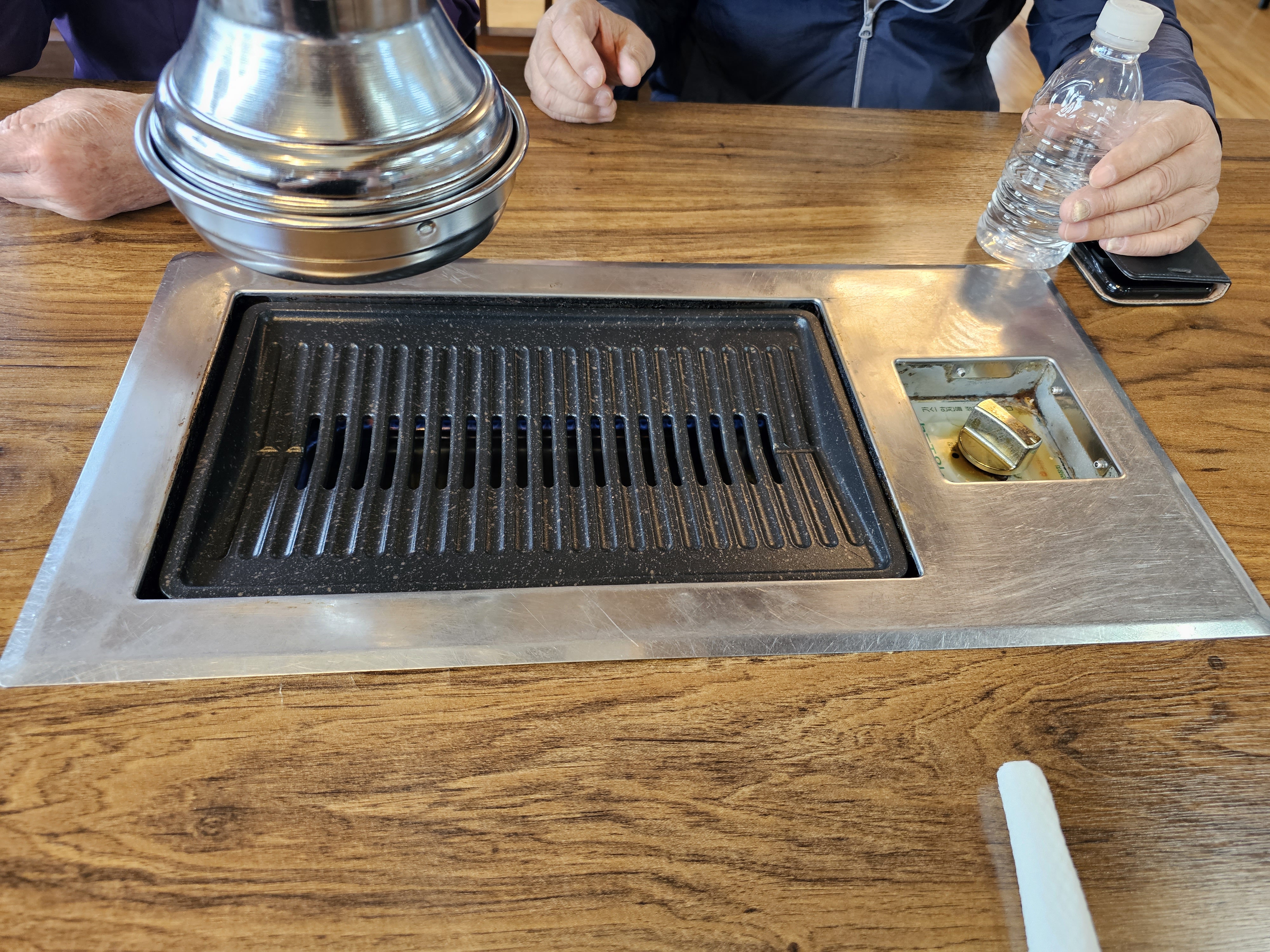 타 오리 고기집 가면 대부분불판이 돌판인데 여기는 특이하게 위와 같은 불판임.