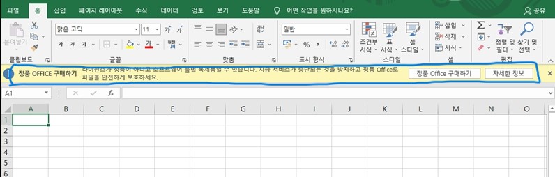오피스 정품 구매자들은 신경쓰실일이 없지만.. 오피스를 KMS 키로 인증 하게 되면, 아래 이미지처럼 팝업창으로 "라이선스가 정품이 아니고 소프트웨어 불법 복제품일 수 있습니다. 어쩌고 저쩌고" 라고 매번 뜨게 되어 있습니다. 우측에 X버튼 누르고 사용하면 이상없이 사용이 가능하기는 하지만 매번 엑셀 열때마다 거슬림.