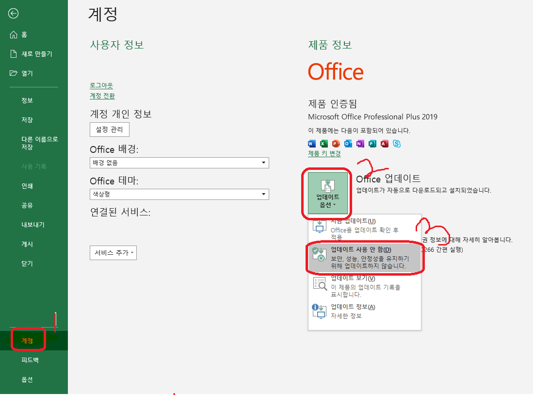 1) 좌측 상단 파일 -> 계정 -> 우측창에 OFFICE 업데이트 옵션 -> 업데이트 사용 안함으로 변경.