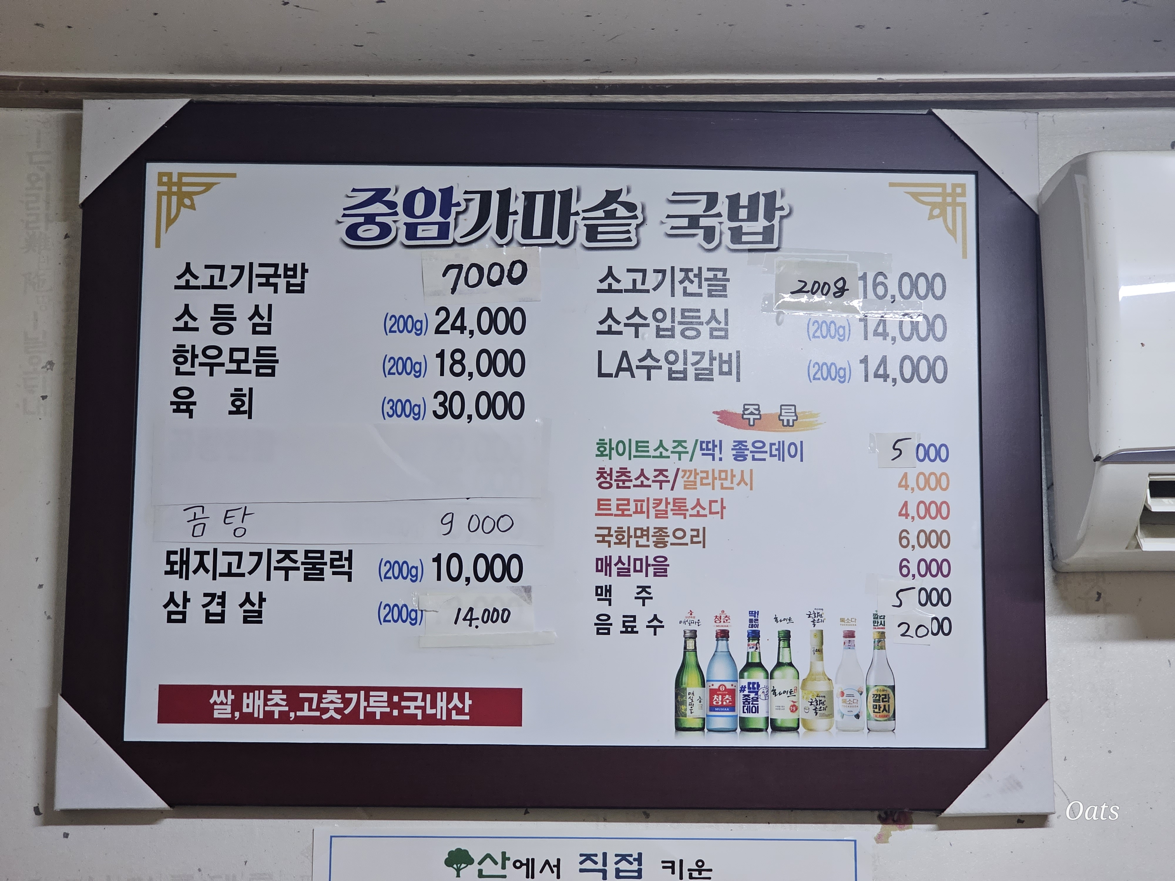 실내 사진은 못찍었고 기본적인 메뉴는 소고기 국밥, 구이, 곰탕등등 판매 하는듯함.