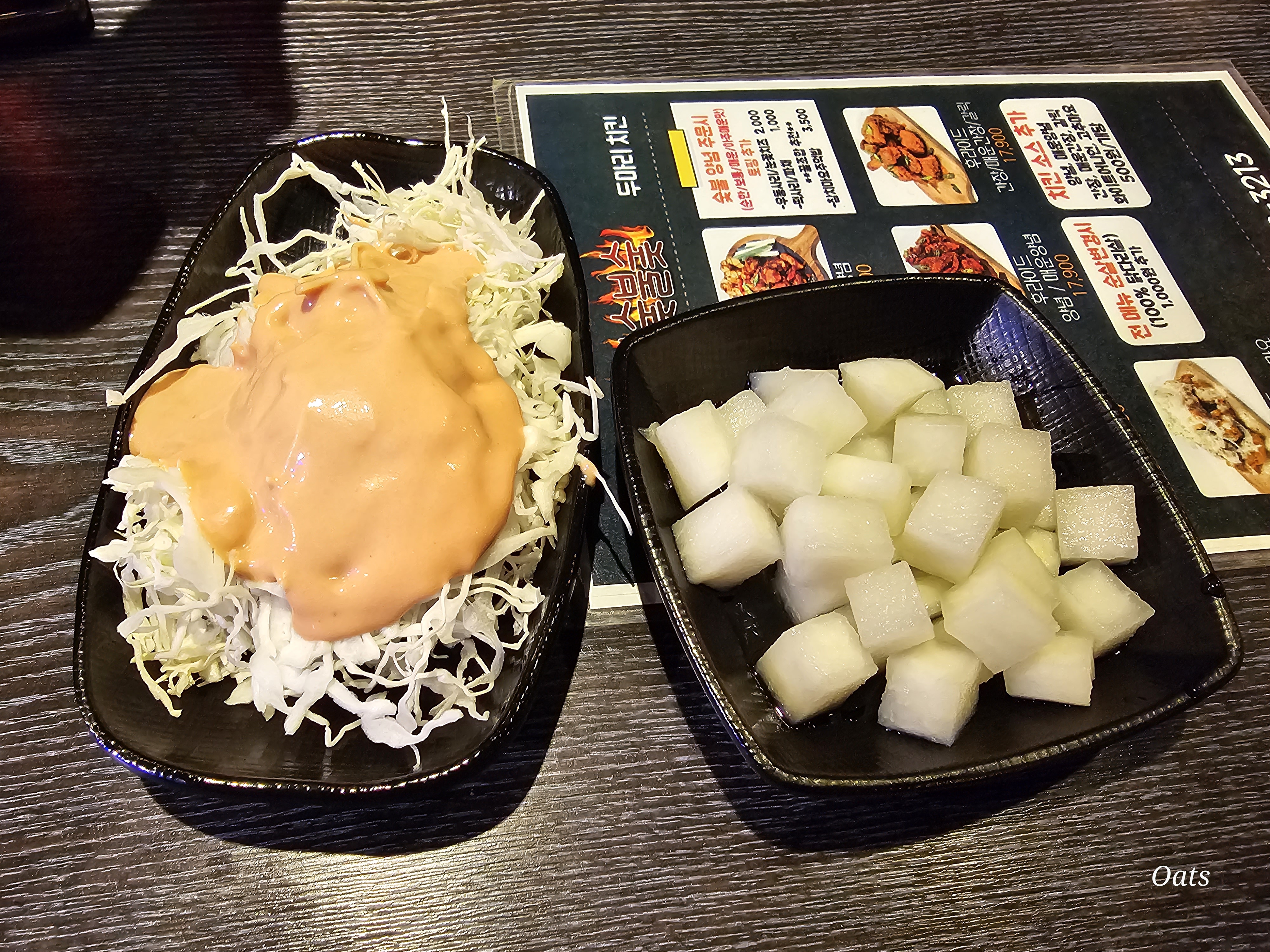 주문을 하면 닭이 나오기전에 바로 나오는 무와 양배추 샐러드 샐러드는 예전감성 그대로이다.