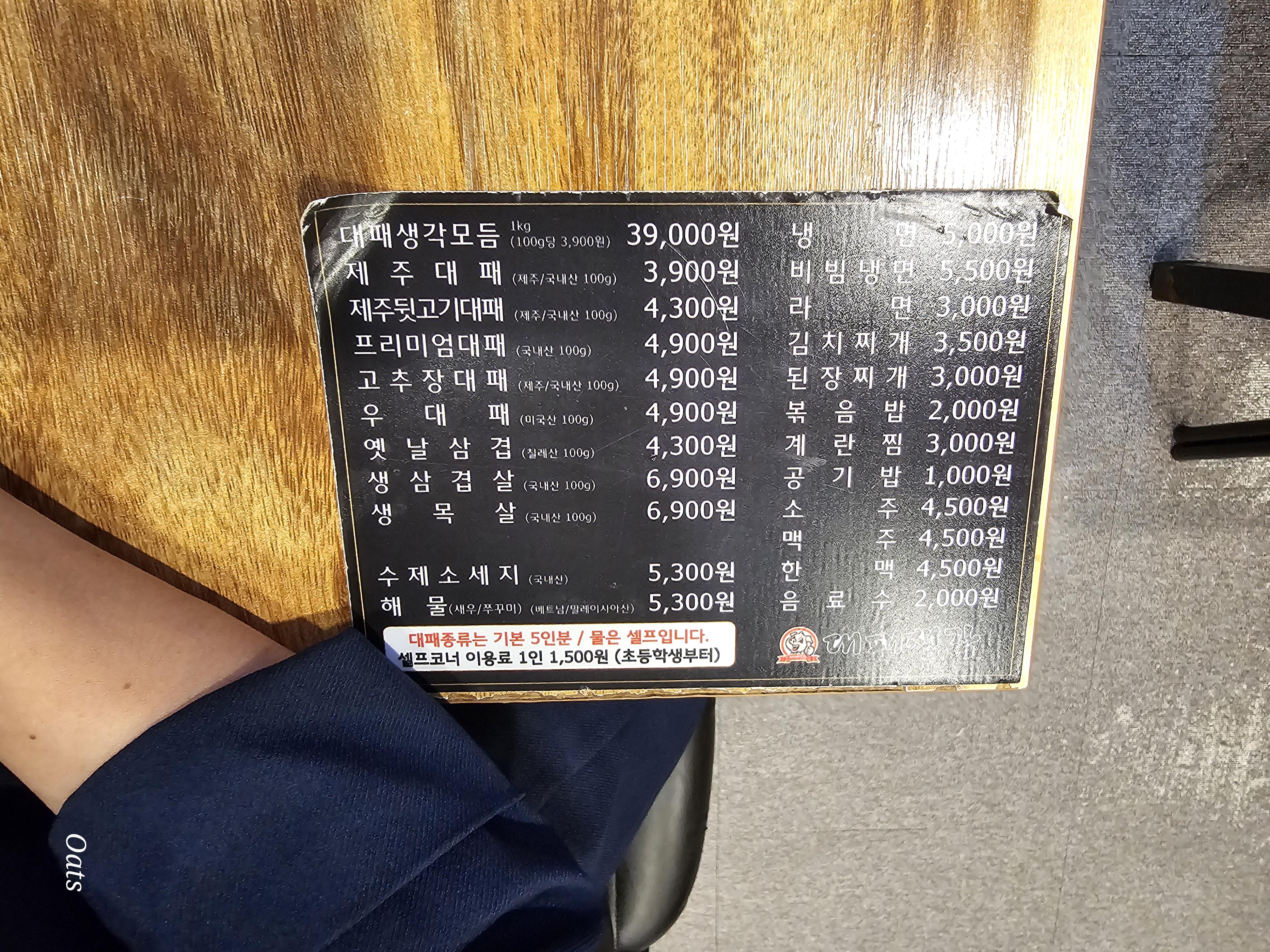 벽에 큰 메뉴판은 있으나.. 앉은자리 위치가 그래서 잘 안보임. 그래서 상 옆에 있는것으로 찍음.