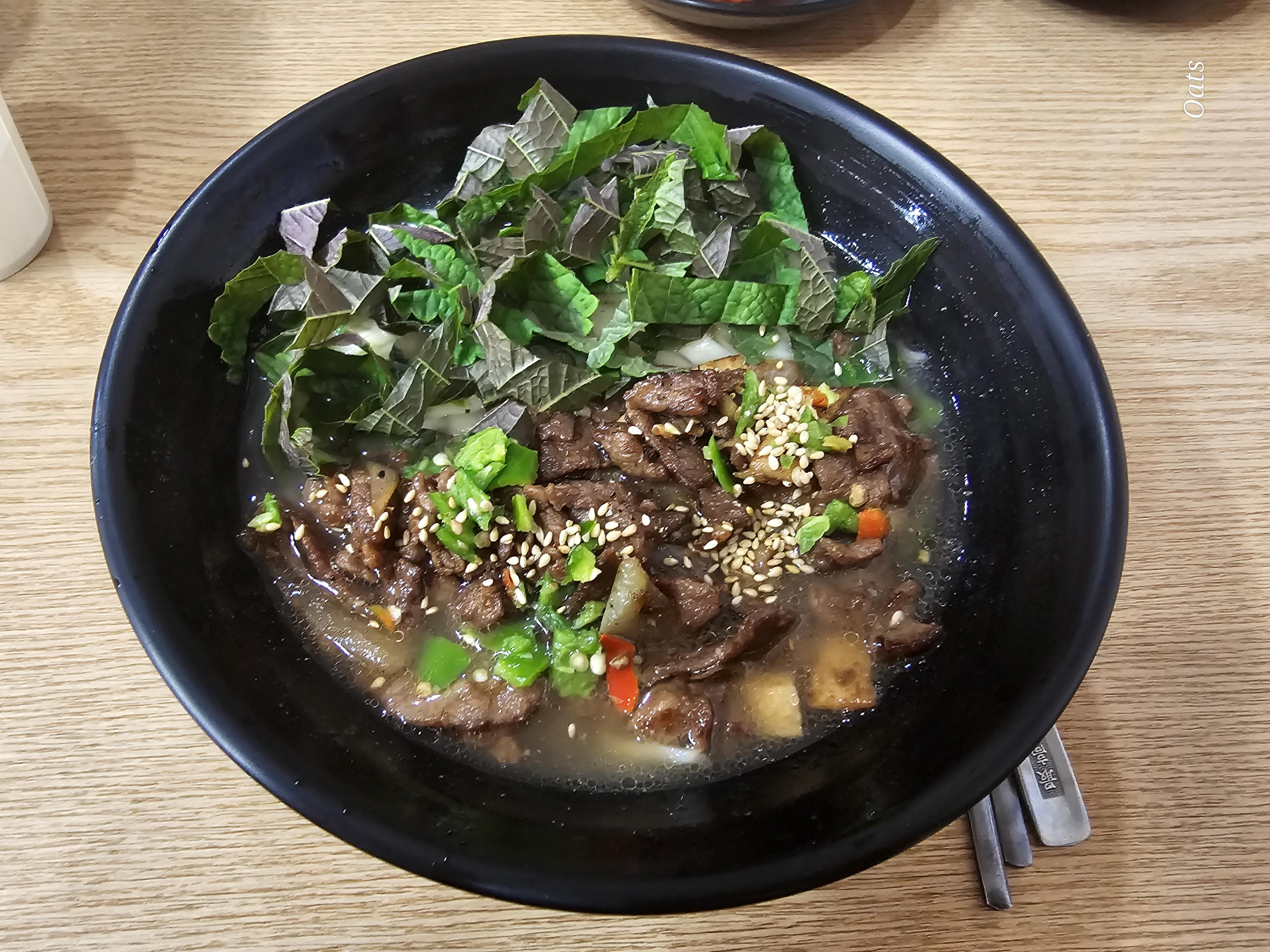 늘 보던 칼국수 비쥬얼은 아님 칼국수 위에 불고기랑 깻잎이 올려져 있음.