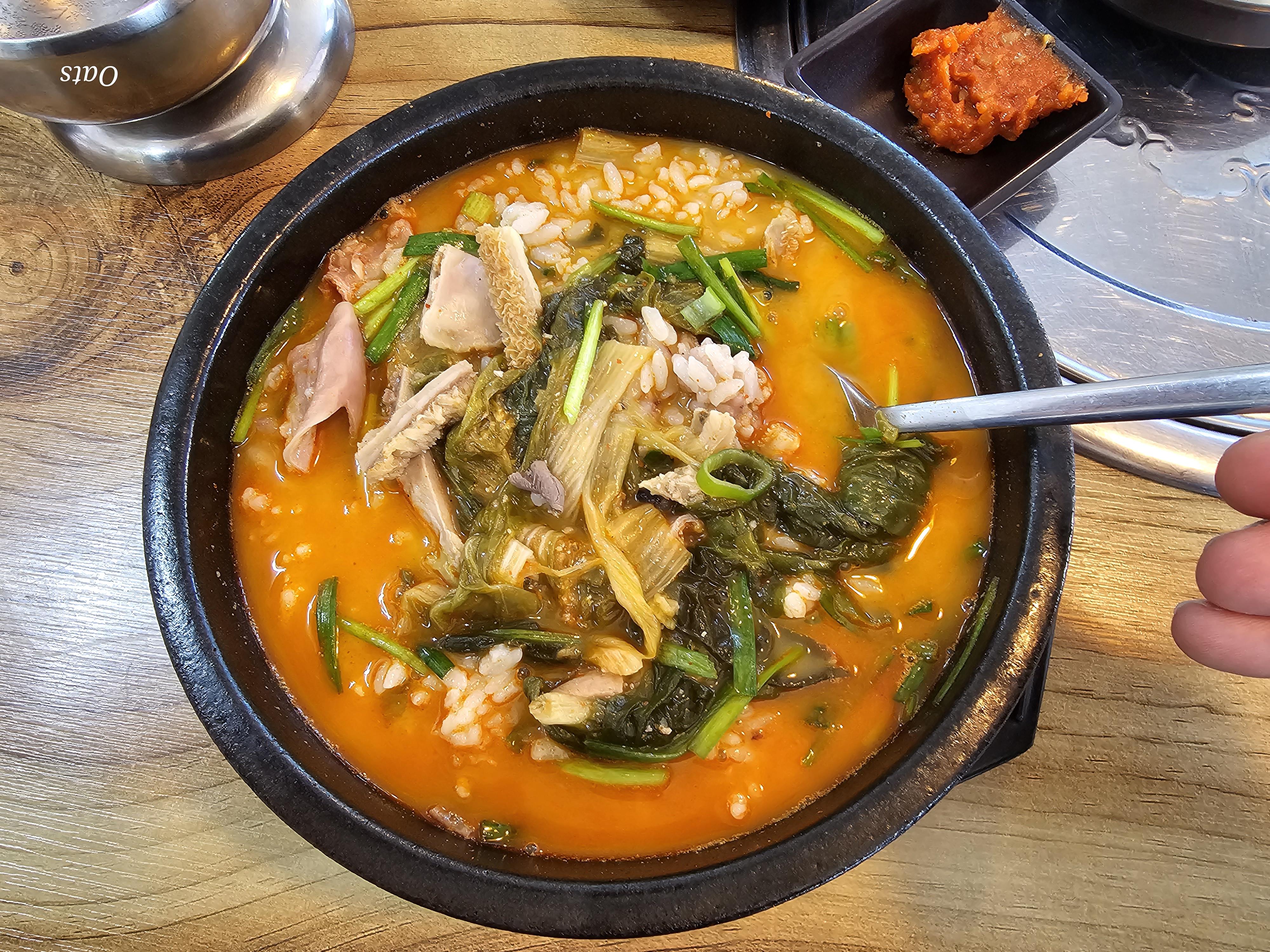 테이블에 들깨랑 새우 젓깔이 있는데 안넣어 먹어도 될만큼 짠편이다... 계속 먹어도 라면국물 맛이다.