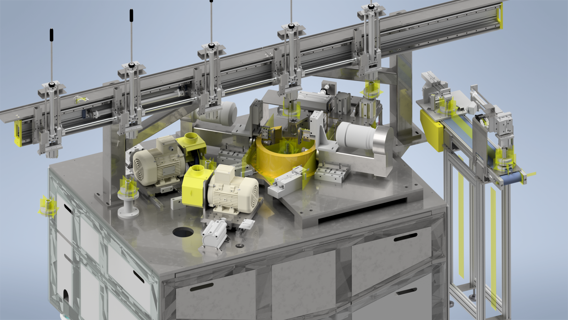 IN STOCKER 제품 공급 -> 기어부 BRUSH -> SHAFT 부 DRILL HOLE 가공 -> 기어부 BURR 압입 제거 -> 비젼검사 -> OUT STCKER 제품 배출