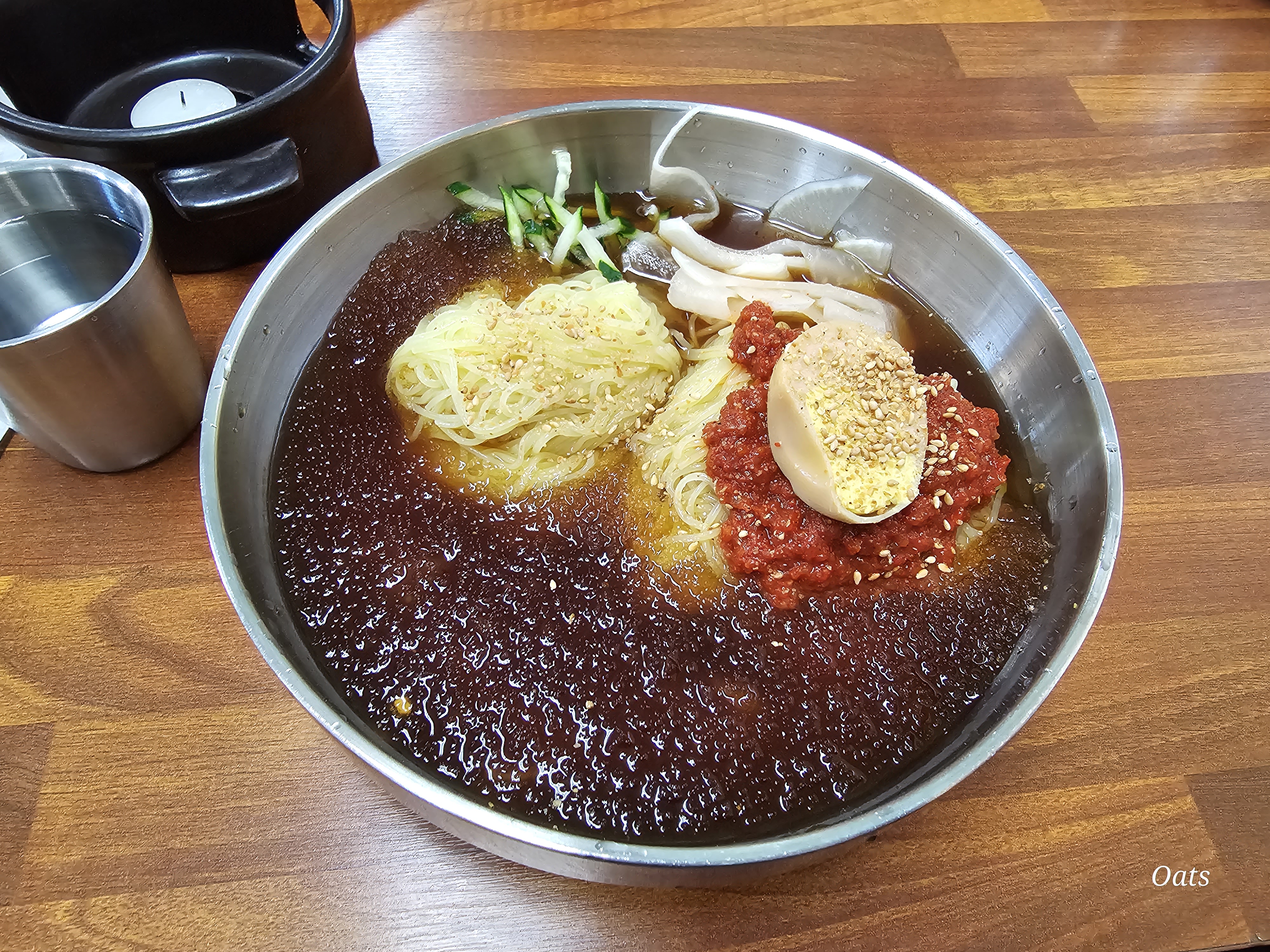 좌측은 밀면 보통, 우측은 밀면 곱배기 밀면은 주문이 들어가면 바로바로 면을 뽑아서 내주신다.