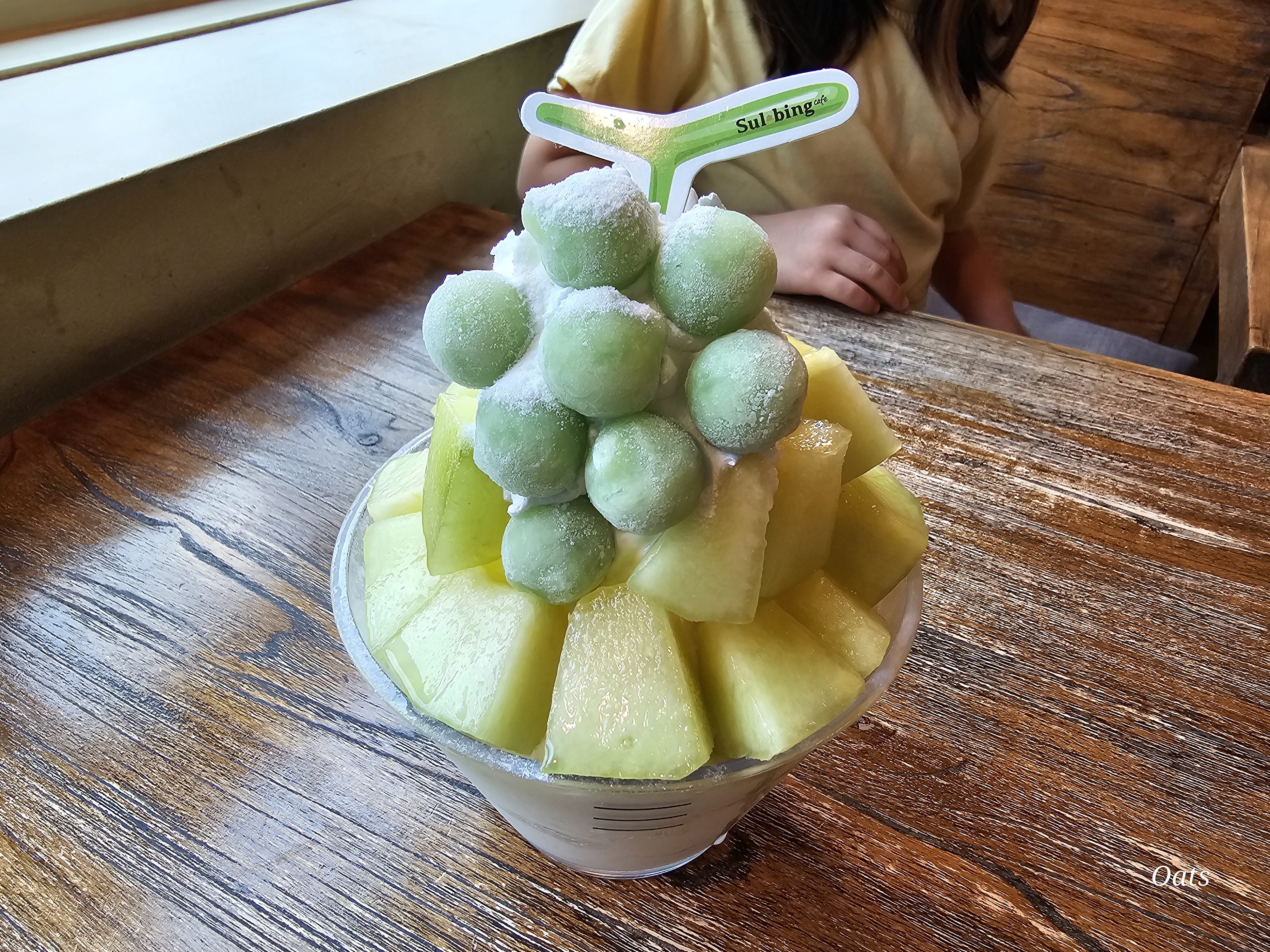 메론 설빙 양이 작아 보이지만 실제로 보면 상당히 크다. 빙수 중간에 시럽이 뿌려져 있는데