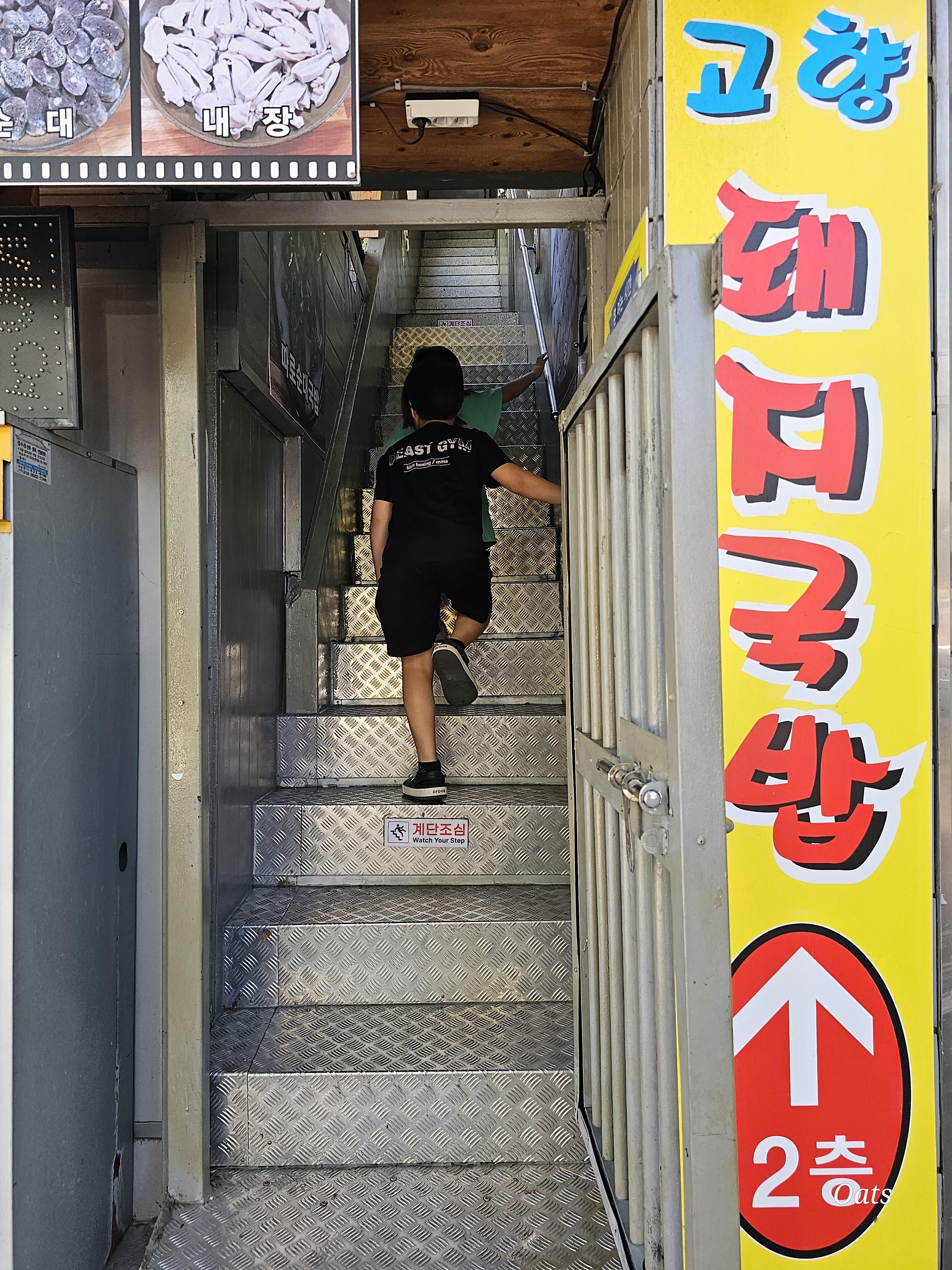 국밥집 올라가는 계단 엄청 가파르다.. 바닥도 체크무늬 바닥 비올땐 상당히 미끄러울듯한 느낌